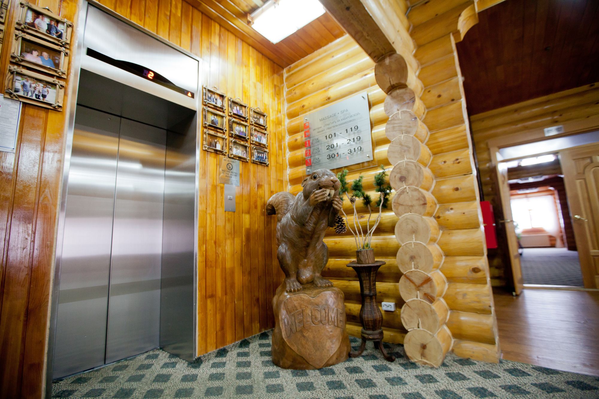 4-х этажное бревенчатое здание гостиницы с цокольным каменным этажом расположилось на небольшой закрытой и охраняемой территории. Номерной фонд, рассчитанный на 98 человек, предлагает гостям 2-х местные номера категории Делюкс, Люкс, Стандарт и 4-х местные Семейные Люксы. Теплые уютные номера с примменением древесной фактуры в интерьерах оснащены ванной комнатой с душевой кабиной, бытовой техникой – ЖК-телевизором, электрочайником, мини-холодильником, феном и системой кондиционирования.