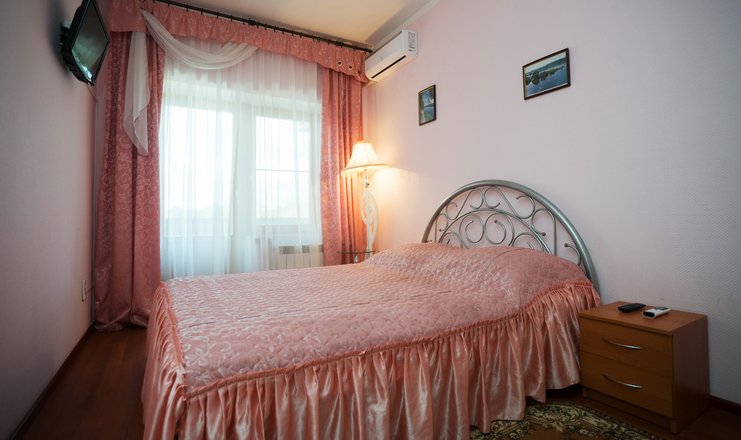 В номере: шкаф-купе, стол-тумба, 2 стула, кровать 1,20 м., ЖК телевизор, кондиционер, холодильник, зеркало, вешалка для верхней одежды.