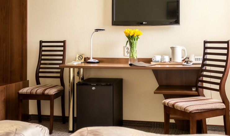 В номере: вешалка, кровати односпальные, прикроватные тумбочки, стол, стулья, шкаф, телевизор ЖК, телефон, холодильник, чайный набор посуды, электрочайник