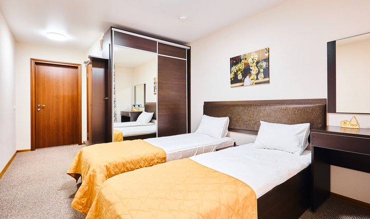 В номере: вешалка, зеркало, кровати односпальные, прикроватные тумбочки, столик туалетный, стул, шкаф, телевизор, телефон, чайный набор посуды, электрочайник