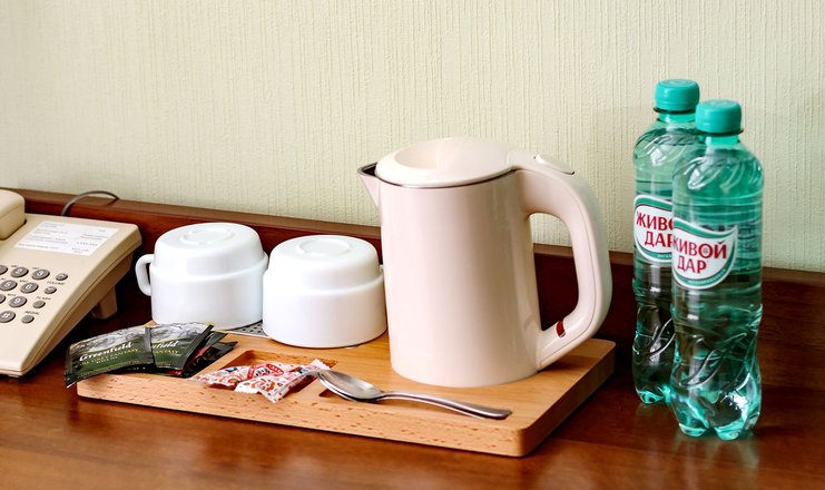 В номере: вешалка, кровати односпальные, прикроватные тумбочки, стол, стулья, шкаф, телевизор ЖК, телефон, холодильник, чайный набор посуды, электрочайник